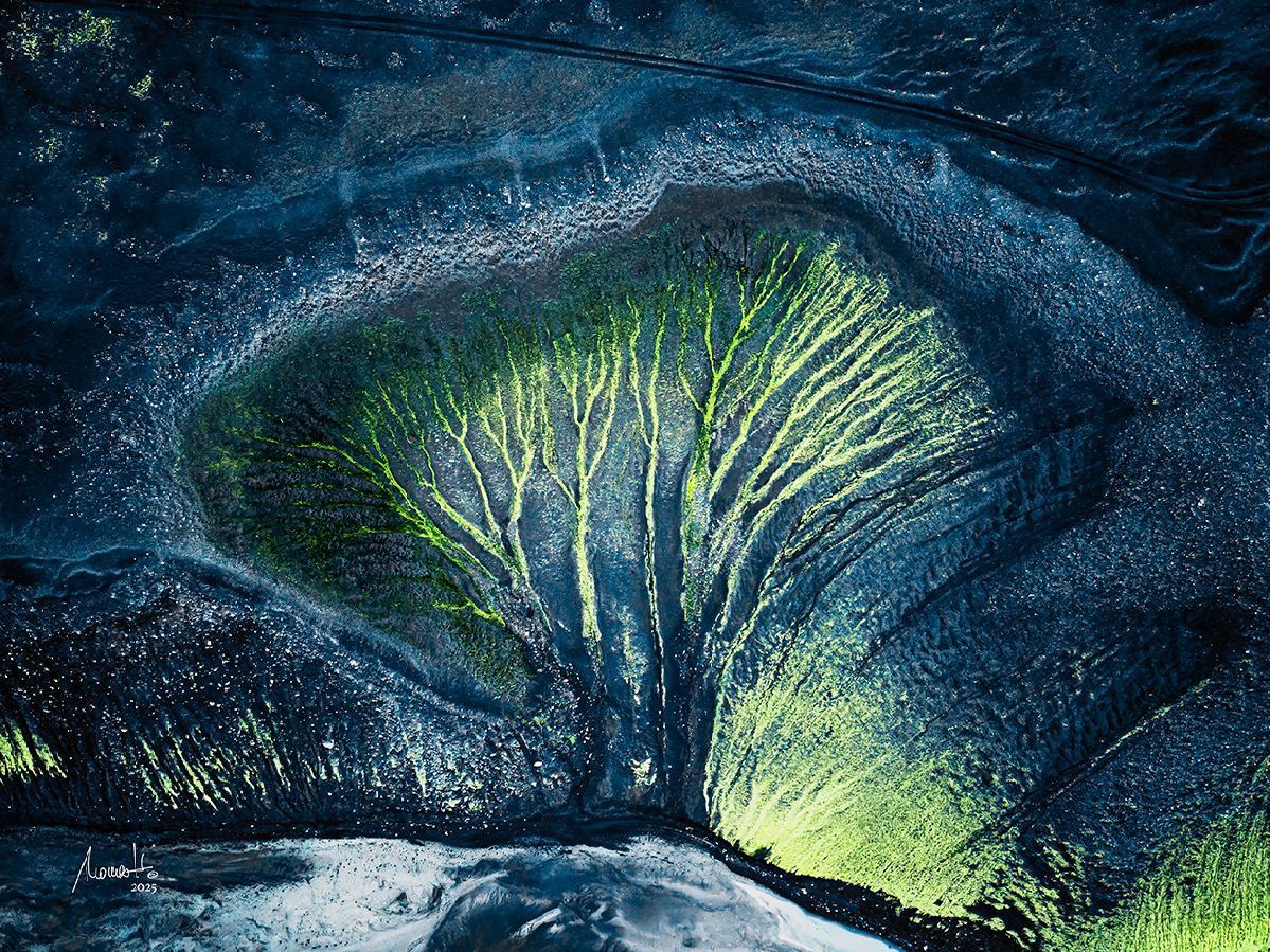 A volcano erupts. Lava carves its way down the mountain, carving furrows into the ground, then cools. Volcanic sediments settle in and around these furrows. Years pass, wind and weather reshape the structures. In a valley in the Icelandic highlands, streams of varying sizes develop, branching out, merging again, and seemingly flowing over and under each other, crossing one another.