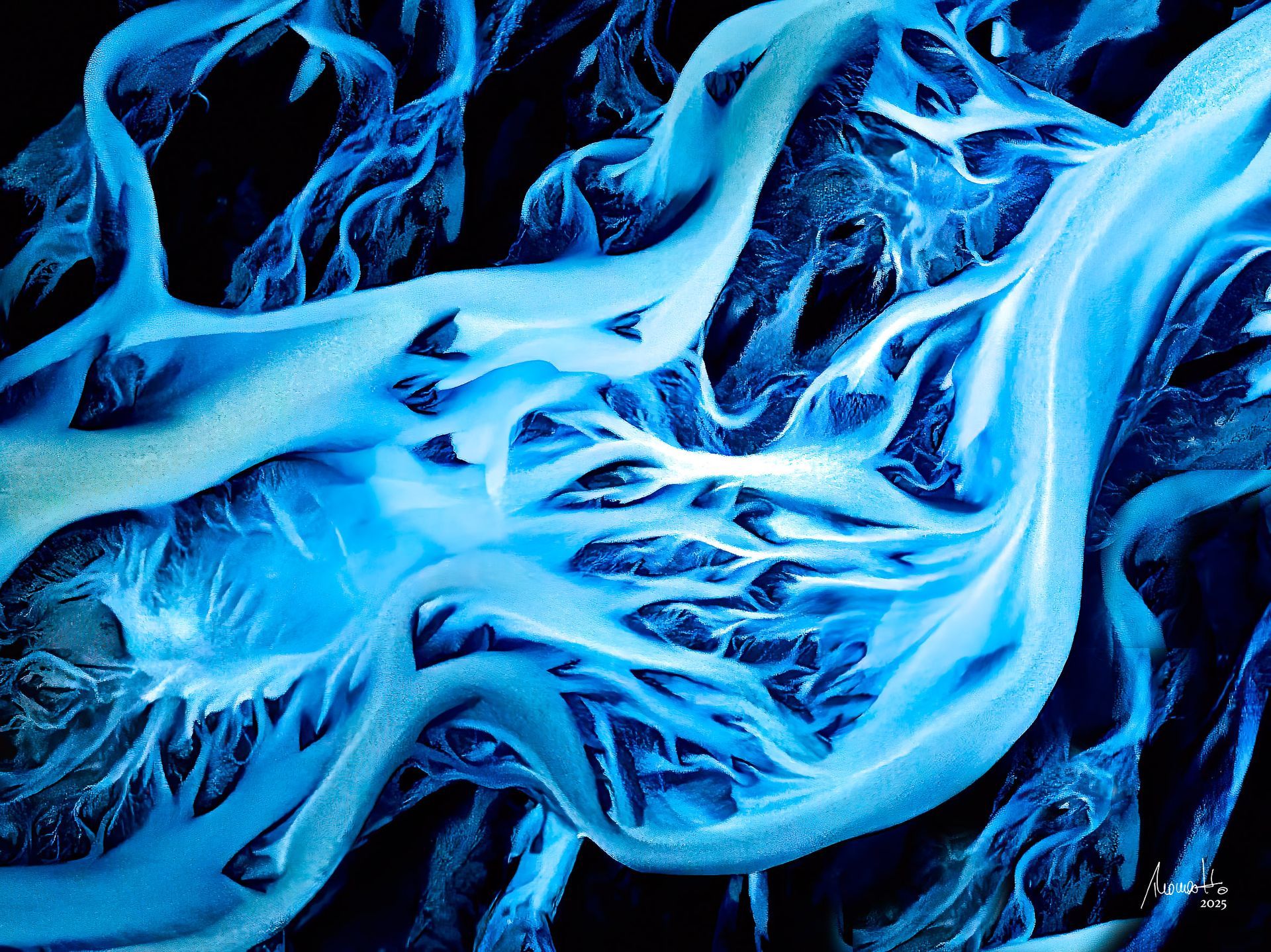 A volcano erupts. Lava makes its way down the mountain, carving furrows into the ground, and cooling. Volcanic sediments settle in and along the furrows. Years pass, wind and weather work on the structures, seeds fly in, and streams develop. In a valley, waterways of various sizes develop, branching out, flowing back together, but also seeming to flow over and under each other, intersecting. A veritable bouquet of flowers appears.