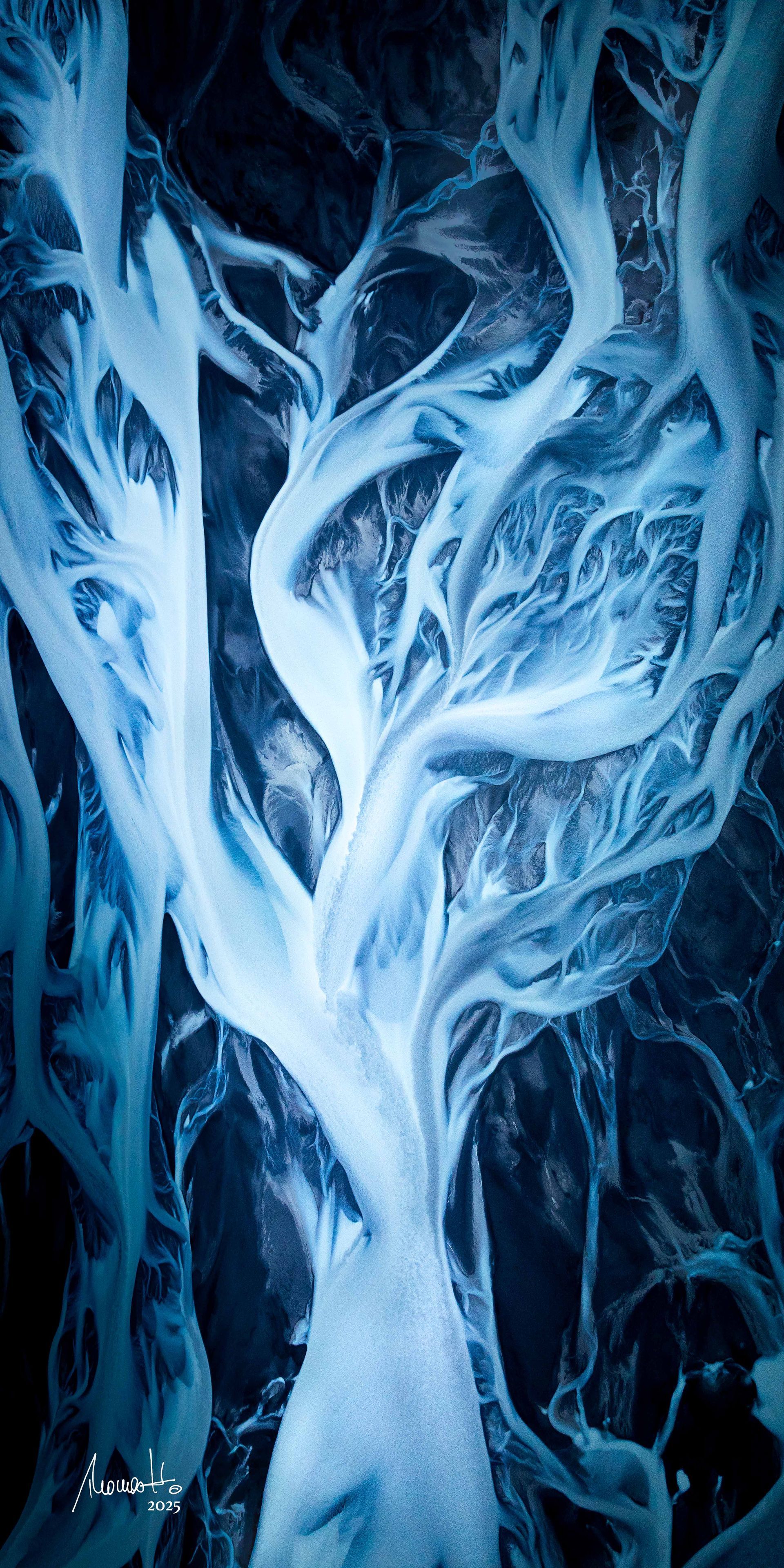 Ein Vulkan bricht aus. Lava bahnt sich ihren Weg den Berg hinab, frisst Furchen in den Boden, erkaltet. Vulkanische Sedimente setzen sich in und an die Furchen. Jahre vergehen, Wind und Wetter arbeiten an den Strukturen, Samen fliegen herbei und Bäche entwickeln sich. In einem Tal entwickeln sich Wasserläufe unterschiedlichster Größe, verzweigen, fließen wieder zusammen, scheinen aber auch über- und untereinander zu fließen, sich zu kreuzen. Ein wahrer Strauß an Blumen erscheint.